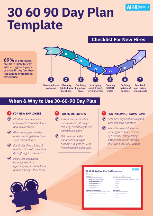 A 30-60-90 day plan is an essential tool that helps HR professionals to support a successful onboarding process by helping new hires and their managers to outline the new employee’s goals and objectives for the first 90 days of their employment across three 30-day phases.