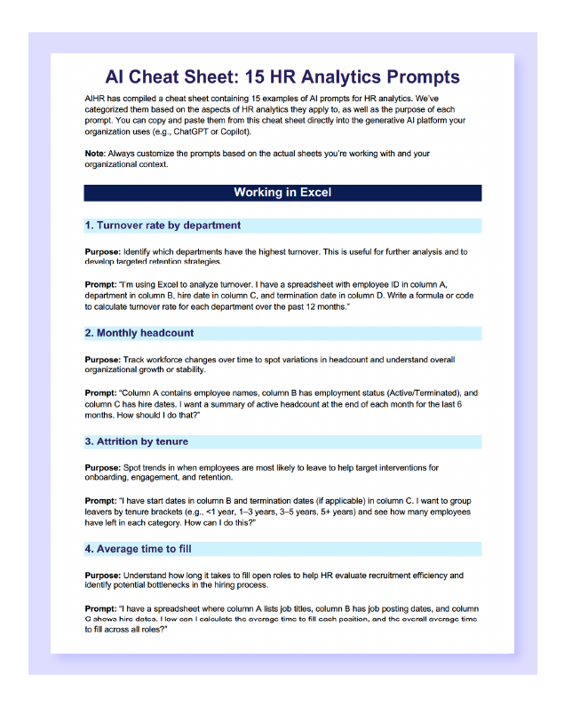 AIHR has prepared a free HR analytics cheat sheet containing 15 AI prompts you can copy and paste directly into whichever generative AI (GenAI) platform your organization uses, such as ChatGPT or Copilot. The prompts in this cheat sheet are helpful whether you use them for working in Excel, workforce forecasting, or HR communications.