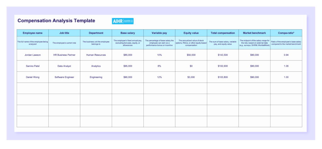 AIHR has created a free compensation analysis template, which offers a clear structure for collecting data, comparing pay, building a professional compensation analysis report, and tracking changes over time. You can also tailor it to match your organization’s goals, culture, and compliance requirements.