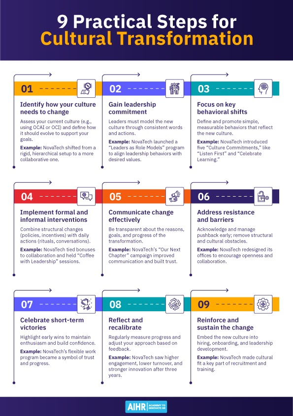 To illustrate how these steps come together in practice, we’ll refer to NovaTech, a fictional global technology company that successfully overhauled its culture after years of declining engagement and innovation challenges. Within four years, NovaTech aligned leadership, systems, and behaviors to build a more collaborative, learning-oriented culture.