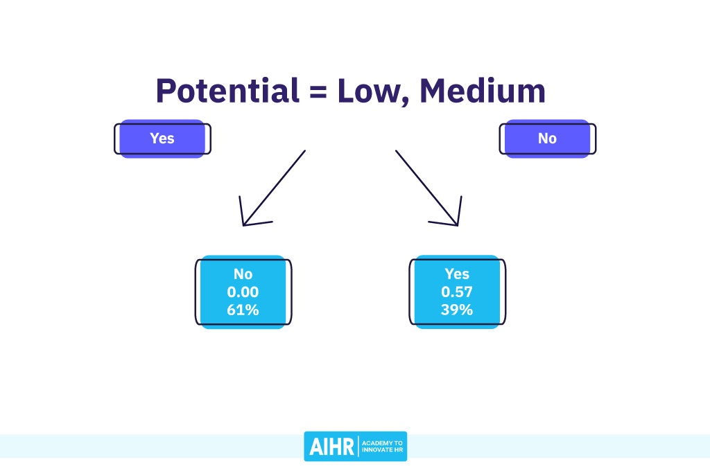 The right-hand node now contains all employees with High Potential. This represents 39% of the dataset. The proportion of turnover here is 0.57 or 57%, and thus the decision tree predicts this groups’ turnover to be “Yes”.