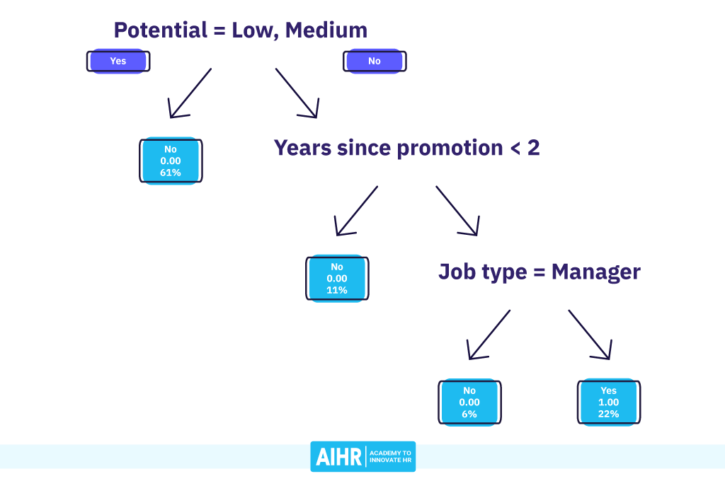 Each decision node forms a conditional test that results in a binary decision rule (yes/no), like “Is this employee a manager?”, “Is this employee a High potential?”, or “Does this team have more than six employees?”.
