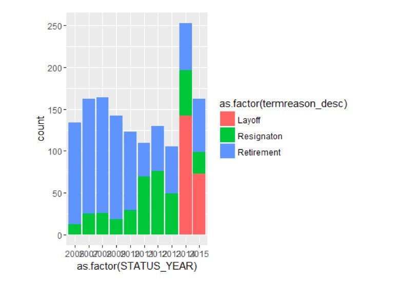 Another example of an R package is ggplot, which helps you to visualize graphs. In a previous article on R Churn analytics, Lyndon showed the distribution of employee turnover for a large Canadian company as seen in the following chart using ggplot.