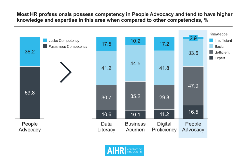 On the flip side, two-thirds of HR professionals (63.8 percent) have shown strong competency in being people’s advocates, which means they are able to create a strong internal culture, get the best out of their people, and act as a trusted champion and communications expert. It is also the competency in which HR professionals exhibit the highest level of expertise (with an average of 15 percent more professionals with sufficient skill level and 4 percent more experts than in the other competencies).