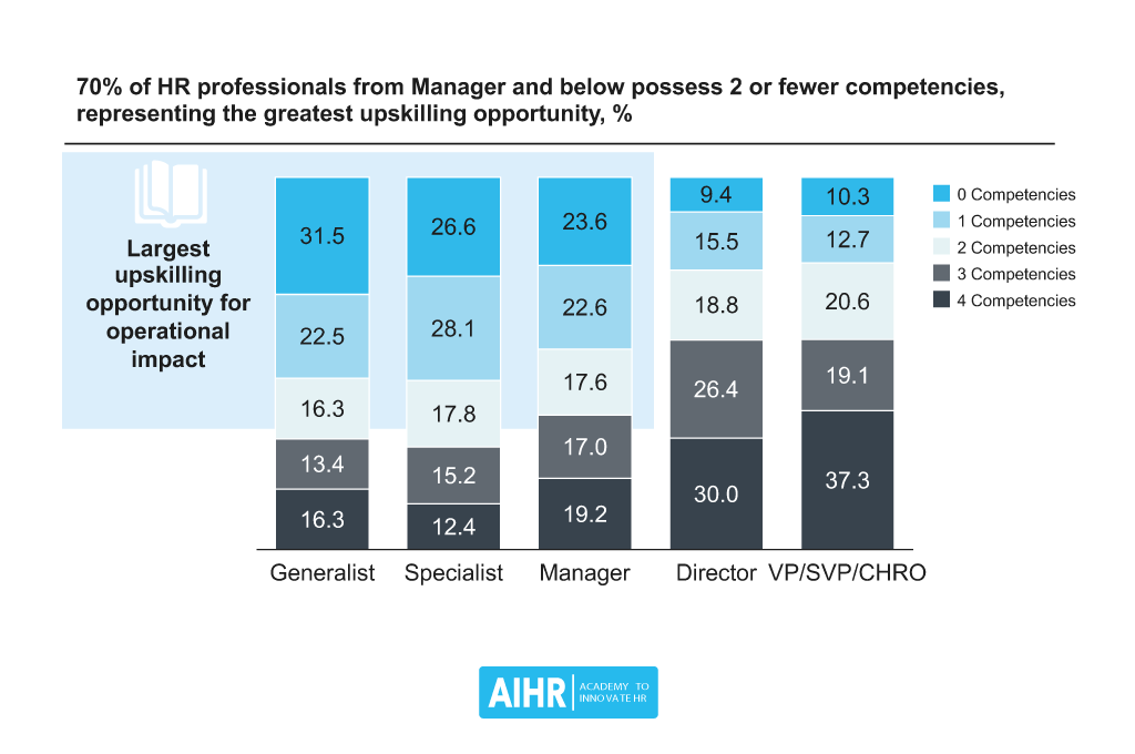 Those who have the largest potential to upskill and become future-proof are HR generalists, specialists, and managers – with 70 percent of them having only a maximum of two core competencies – as opposed to the more senior professionals such as HR directors, VPs, SVPs, and CHROs – where this is only 42 percent.