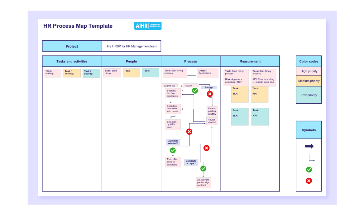 AIHR has created a free, customizable process map template for HR to help you begin process mapping, and provide your team and key stakeholders with clear direction and updates. You can download it for free, and tailor it to best suit your organization’s specific needs, goals, and culture.