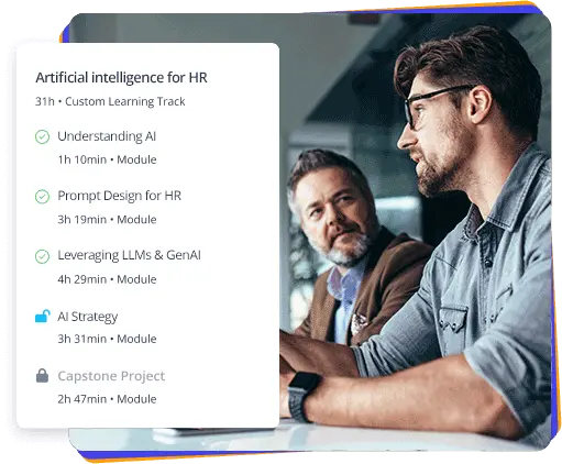 combines online courses with live sessions to rapidly upskill your team on AI for HR concepts. We handle